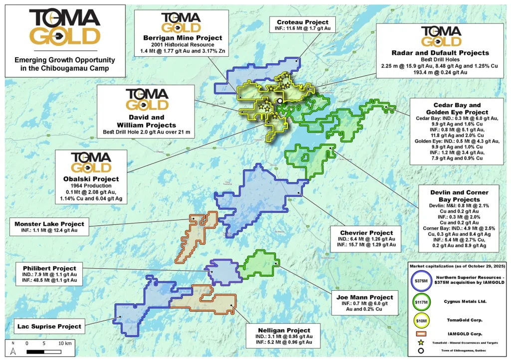 TomaGold is a Canadian junior mining company focused on the acquisition, exploration, and development of high-potential precious and base metal projects, with a primary focus on gold and copper in Quebec and Ontario. The Company seeks to enhance shareholder value by acquiring and advancing a diversified portfolio of properties, with a focus on successful exploration and the discovery of new mineral resources. Operating exclusively in Canada, TomaGold benefits from established infrastructure, skilled local resources, and access to historical data from current or nearby properties.