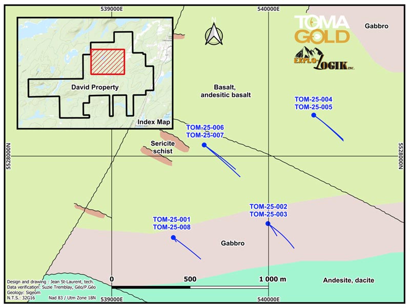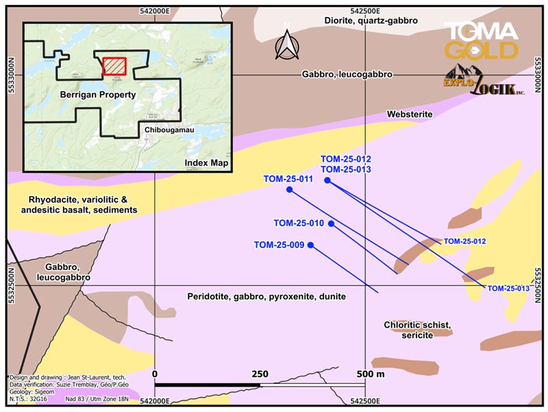 TomaGold has completed an initial 4,420 metres of diamond drilling at the end of Q3 2025 within the Chibougamau copper-gold mining camp. This initial program comprised 2,615 metres across eight holes on the David Project (Table 1 and Figure 1) , optioned from SOQUEM, and 1,805 metres across five holes on the Berrigan Mine Project (Table 2 and Figure 2), optioned from Chibougamau Independent Mines. Assay results are pending.
